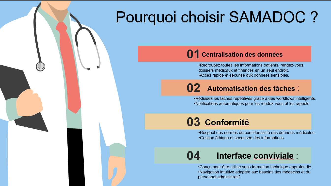 SamaDoc, c’est l’outil idéal pour simplifier la gestion médicale et vous permettre de vous concentrer sur l’essentiel : la santé de vos patients.